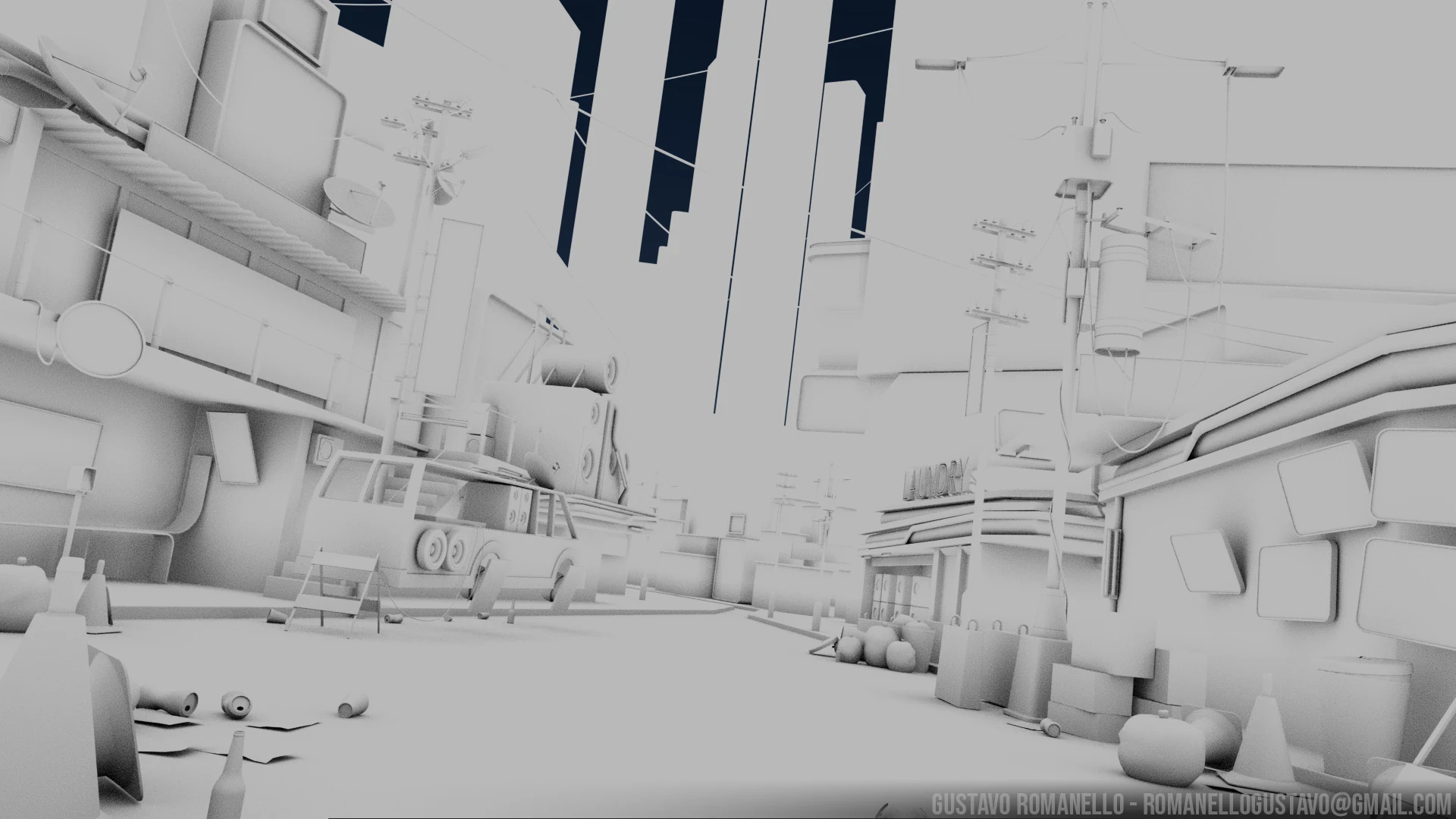 This project was a real challenge due to the lack of orthographic lines in its architecture. Every single line/building is not aligned with the other to create a sense of chaos and dynamism. Working with a cyberpunk style was a lot of fun and out of my comfort zone. I am accustomed to maintaining a hyper-realistic style, and this project helped me develop another aesthetic. Modeling an infinite number of details, such as garbage, cables, power poles, lights, pipes, and signs, was a great way to speed up my modeling and UV skills. Working on this way was a challenge to texture since I didn't have many repetitive assets to reuse, so it took me more time on that aspect, but the final result is dynamic and fun to explore.